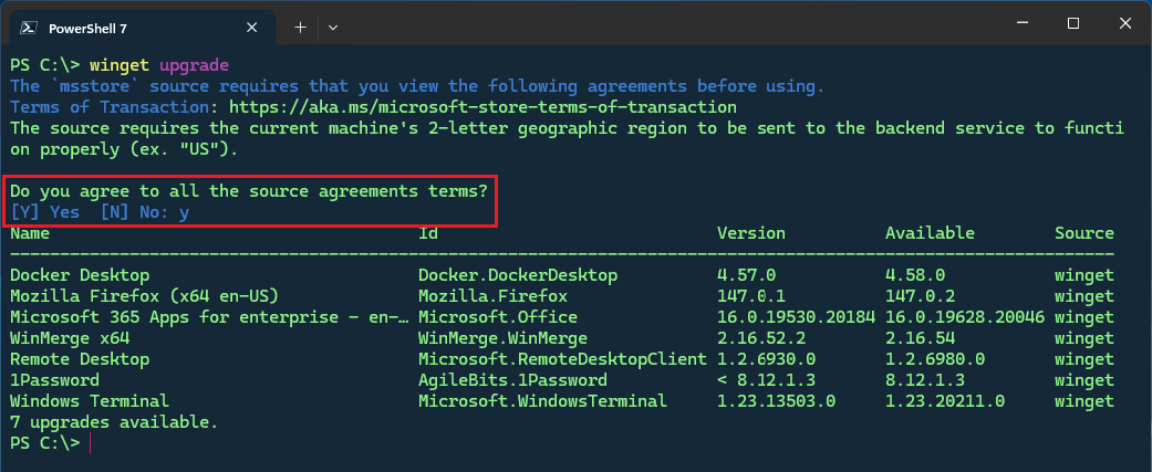 Note: If this is your first time running WinGet, you will be prompted to accept the Microsoft Store terms to continue.