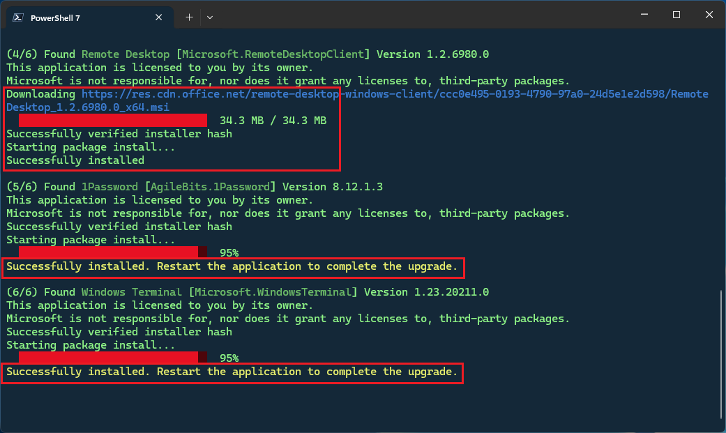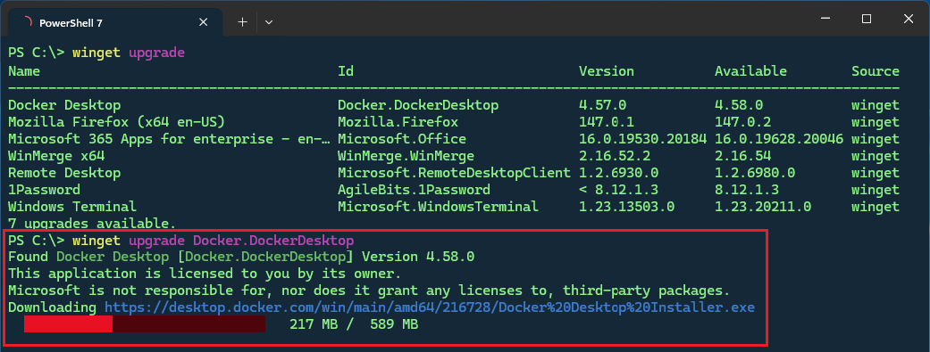When you press the Enter key, WinGet will download each app update and automatically begin the upgrade process.