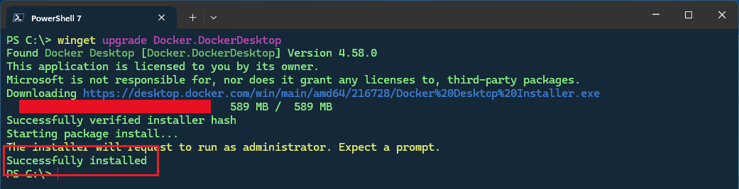 WinGet will automatically begin the upgrade process when the download completes.